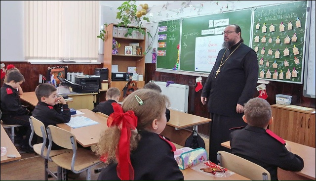 Урок о Рождестве Христовом в казачьей школе Настоятель храма Успения Пресвятой Богородицы города Тимашевска протоиерей Сергий Григорович посетил казачью школу...