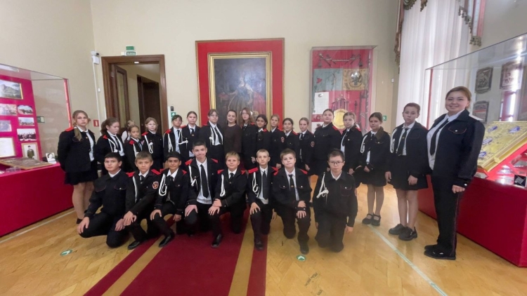 Вторая часть экскурсии прошла в зале регалий и реликвий Кубанского казачьего войска Краснодарского государственного историко-археологического музея-заповедника им. Е.Д. Фелицына. Здесь казачата увидели уникальные коллекционные предметы: боевые знамена, наградные ордена, историческое оружие, элементы форменной одежды и другие артефакты, отражающие воинскую доблесть и самобытный дух казачества.
