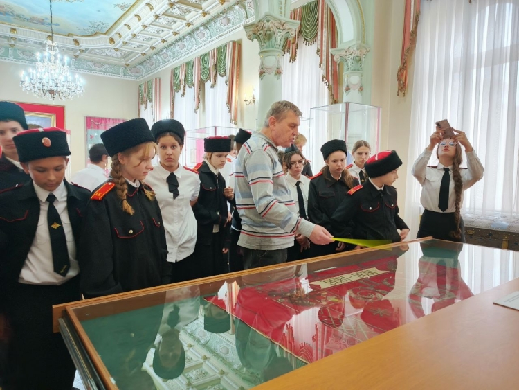 Экскурсанты увидели Жалованную грамоту, подписанную императрицей Екатериной II, знамёна и хоругви, символы атаманской власти, а также ценные дары, преподнесённые Кубанскому казачьему войску российскими императорами и высокопоставленными особами.