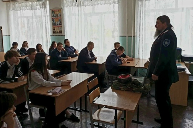 В казачьей школе № 8 им. Н.С. Бороденко в х. Беднягина прошел урок мужества, организованный казаком-наставником Иоанном Ильичом Захаровым для учеников 9 класса. Темой этой встречи стало важное и трогательное событие – «Дети войны».