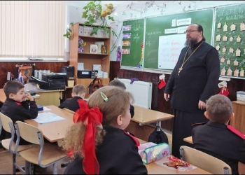 Урок о Рождестве Христовом в казачьей школе Настоятель храма Успения Пресвятой Богородицы города Тимашевска протоиерей Сергий Григорович посетил казачью школу ...
