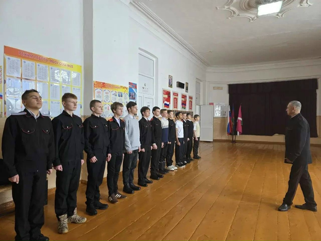 В казачьей школе 25 станицы Ладожской атаман ладожского хуторского казачьего общества Вадим Быченко организовал занятия с казачатами в рамках подготовки к районной игре «Казачий дозор». Программа включала элементы строевой подготовки, составление карты Краснодарского края, а также сборку и разборку автомата Калашникова.