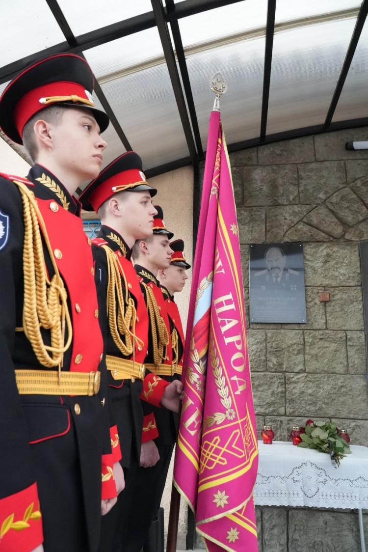 Право открыть памятную доску предоставили семье Ивана Васильевича. Кадеты и все присутствующие возложили цветы к портрету атамана, склоняя головы в знак уважения в минуте молчания.