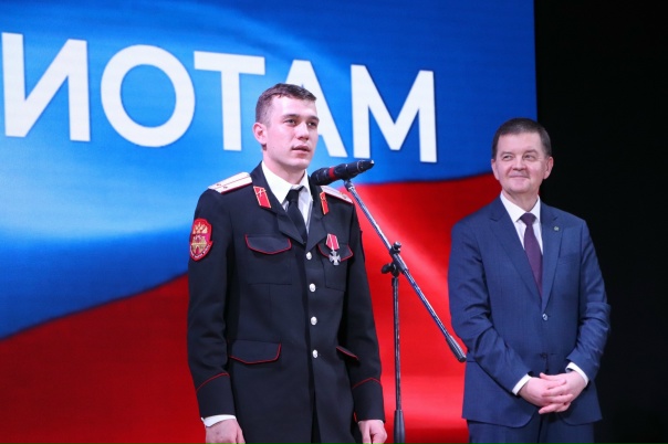 Председатель Союза казачьей молодежи Кубани, участник спецоперации Даниил Дьяченко вручил почетную грамоту атамана Кубанского казачьего войска атаману казачьей сотни КубГАУ Артему Приходько. Юный казак получил награду за вклад в развитие кубанского казачества, активное участие в мероприятиях по сохранению и изучению традиций кубанского казачества, а также за организацию работы по развитию казачьей сотни.